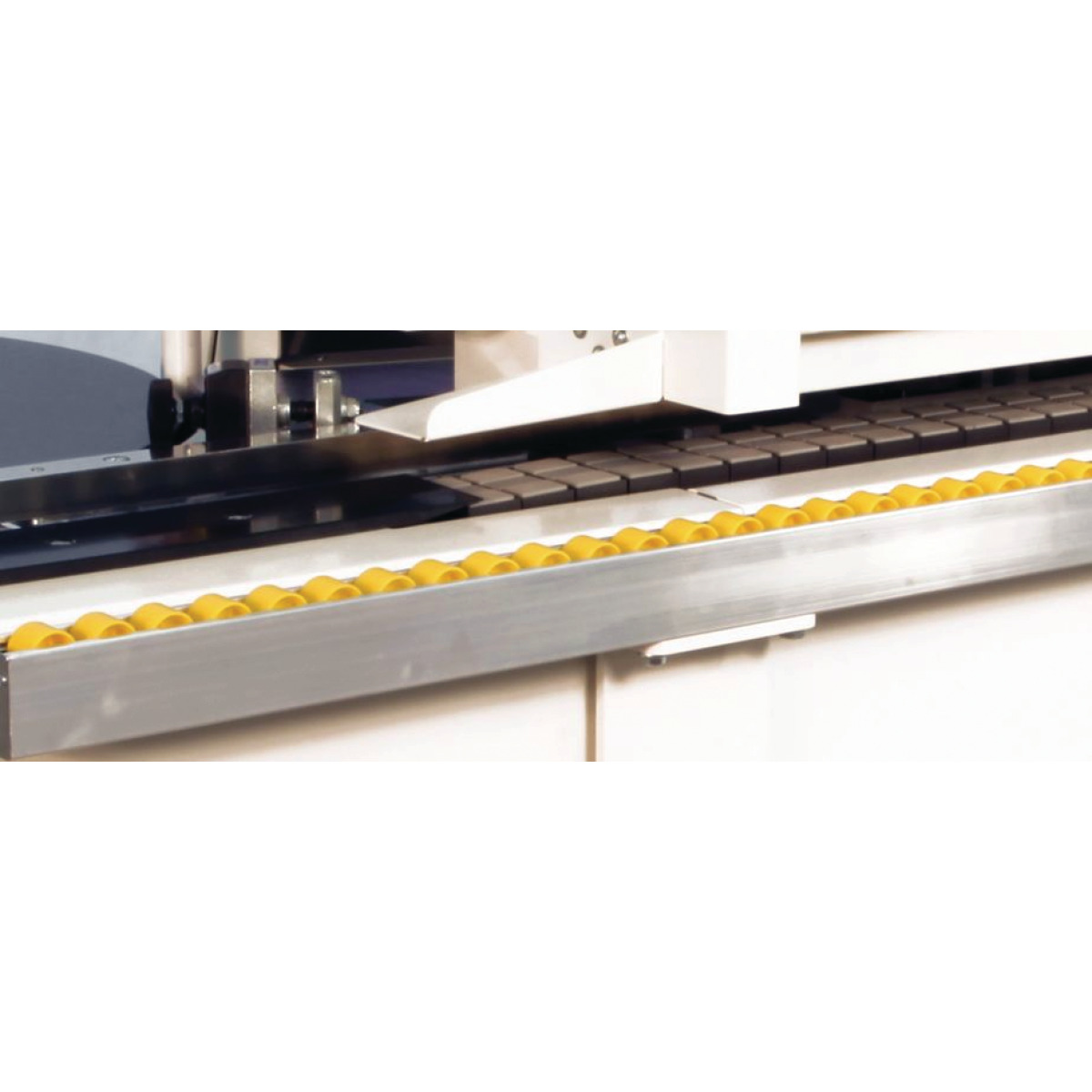 Panel feed via feed chain with rubber glide shoes